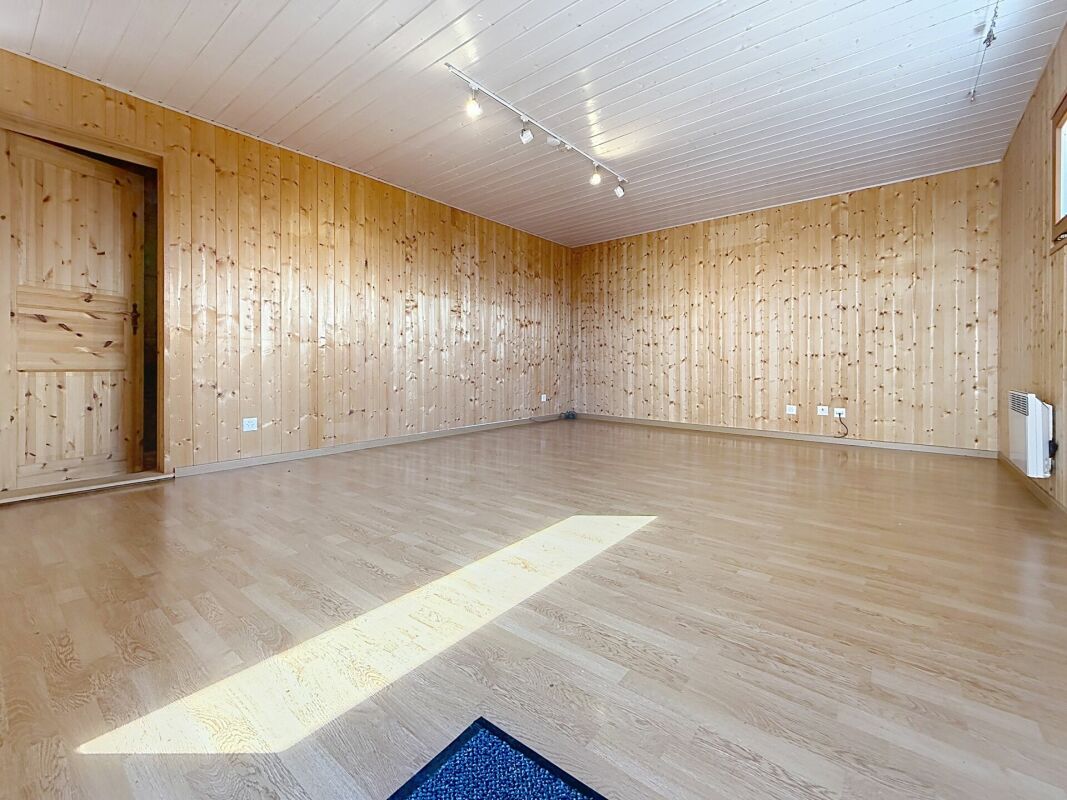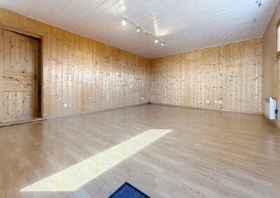 Parquet chêne massif à l'étage et mélèze à la cave.